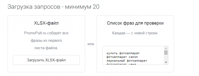 Загрузите собранные запросы для кластеризации. Это можно сделать двумя способами: скопировать список или загрузить XLSX-файл. Обязательное условие — минимальное количество фраз должно быть не меньше 20. Верхний предел не ограничен.