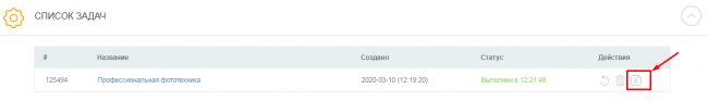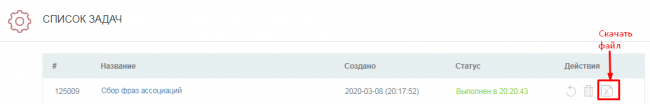 Нажмите «Запустить проверку» и подождите, пока собранные запросы будут доступны в «Списке задач». Статус «Выполнен» указывает на то, что XLSX-файл доступен к скачиванию. Сам сбор фраз-ассоциаций в среднем занимает 3–5 минут.