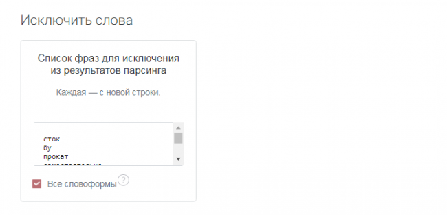 В список «Исключить слова» внесите фразы, которые исключаются из парсинга.
