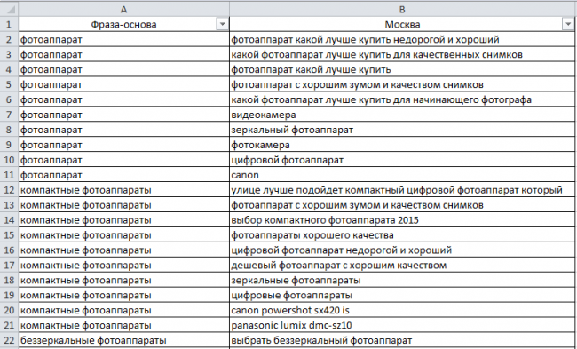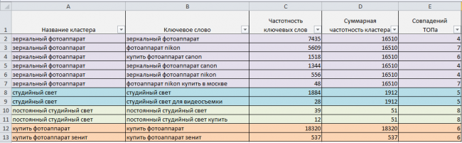 В результате получим сгруппированные ключевые слова для рекламы интернет-магазина фототоваров.