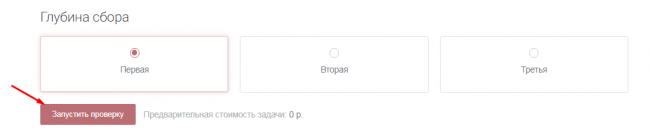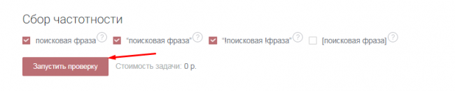 Для сбора частотностей по указанным фразам нажмите на кнопку «Запустить проверку». Время получения результата зависит от количества фраз, типов соответствия и регионов. Готовый отчет появится в списка задач через 1–2 минуты.