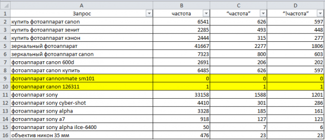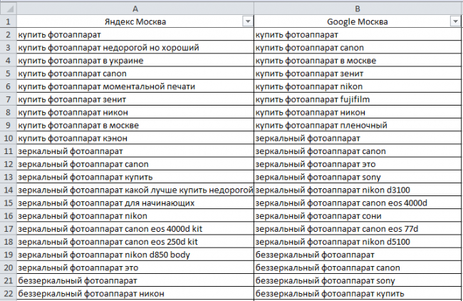 Итак, мы дополнительно собрали еще 540 ключей. Конечно, не все они релевантны, ведь полное совпадение по ассортименту редко встречается даже у ближайших конкурентов.