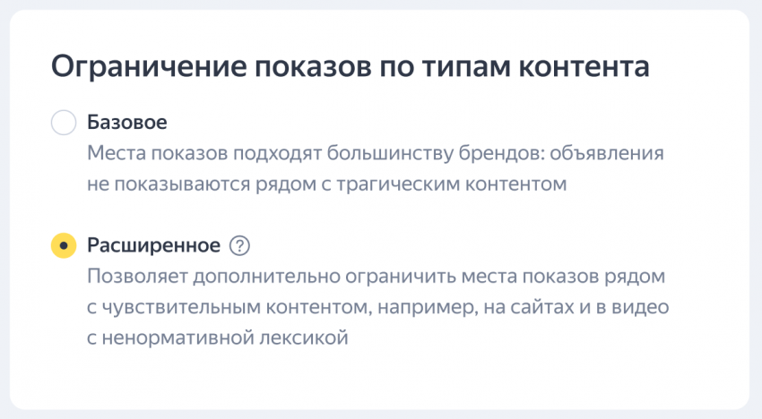 На данный момент Яндекс по умолчанию не показывает рекламу на сайтах с трагической тематикой контента. Теперь же новая функция позволит рекламодателям отключать показ кампаний в местах, где контент не соответствует политике или ценностям бренда. Так, демонстрацию объявлений можно ограничивать на сайтах, где опубликованы материалы для взрослых, а также на площадках, связанных с азартными играми, оружием, табаком и прочим.