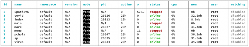 В этой статье я расскажу о самом удобном, на мой взгляд, диспетчере процессов. Покажу, как его установить и настроить свои проекты (например: скрипт для автопостинга, сервис на ReactJS). PM2 запускает приложения и скрипты в режиме 24/7 и решает проблему с их вылетами путем автоматического перезапуска с сохранением лога. Это решение особенно полезно для тех, кто держит на своем сервере большое количество скриптов и нуждается в их удобном управлении. Рассмотрим установку и настройку на примере Ubuntu 18.04. Установка Так как PM2 написан на Node.js и устанавливается с помощью npm, нужно установить их на свой виртуальный сервер: Теперь устанавливаем сам диспетчер процессов: Готово! PM2 на сервере. Настройка PM2 в основном предназначен для приложений Node.js, но работает и с остальными языками программирования. Чтобы запустить приложение, используем команды в консоли. Для Node.js: Для остальных языков программирования (на примере Python 3): Если ваше приложение завершит работу с ошибкой, PM2 автоматически перезапустит его, что очень удобно. После запуска скриптов и приложений можно посмотреть информацию о них с помощью команды в консоли: Пример того, что мы увидим: В таблице показано количество рестартов, потребляемая память и нагрузка на процессор от приложений. Для удаления, запуска, рестарта и остановки приложений из списка нужно посмотреть порядковый номер (id) процесса в таблице, которую можно вызвать командой, указанной выше, и написать команды в консоли. Остановка: Запуск: Рестарт: Удаление из списка: Также можно просмотреть логи отдельных приложений. Для этого используем эту команду: И выбираем свое приложение из списка. Если вам неудобно следить за логами и запуском приложений через консоль, то это можно делать даже в браузере, установив веб-версию PM2 одной командой: После этого вводим свои данные для регистрации и переходим по ссылке, которая отобразится в консоли. Пример того, что мы увидим: Мы разобрали основные команды менеджера процессов. Удачи в ваших проектах!