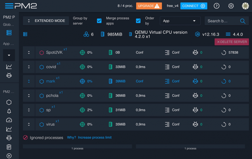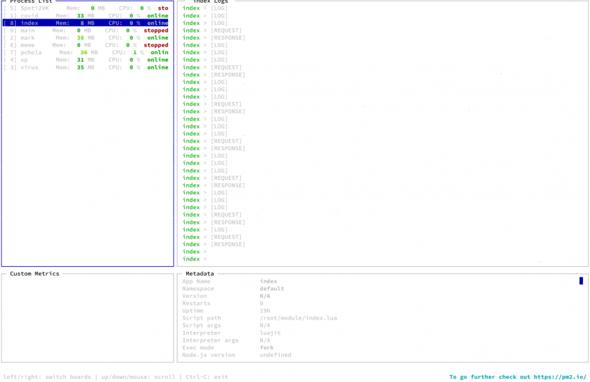 Если вам неудобно следить за логами и запуском приложений через консоль, то это можно делать даже в браузере, установив веб-версию PM2 одной командой: