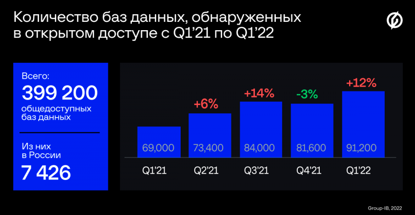 А всего в сети в период с первого квартала 2021 по первый квартал 2022 года было найдено 399 200 незащищенных баз данных, где почти 7500 находятся в России.