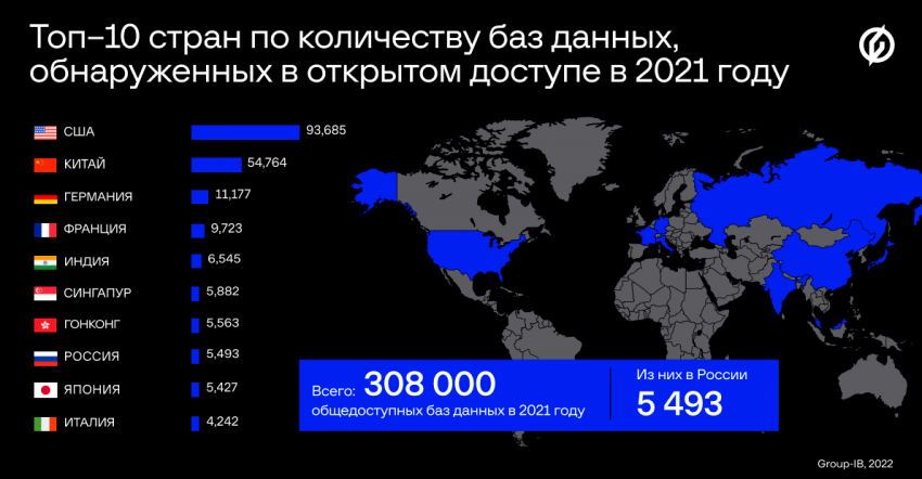 Специалисты по кибербезопасности из Group-IB предоставили отчет, в котором говорится, что в 2021 году количество незащищенных баз данных в мире насчитывало 308 000, из которых на российских серверах – 5493 БД.