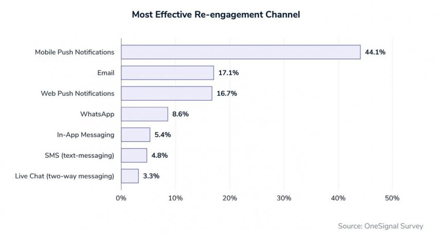 Компания OneSignal исследовала особенности взаимодействия брендов с покупателями. Результаты показали, что мобильные пуш-уведомления являются самым эффективным каналом для повторного общения с клиентами. Второе место по популярности заняли email-рассылки, а на третью позицию попали веб-пуши.