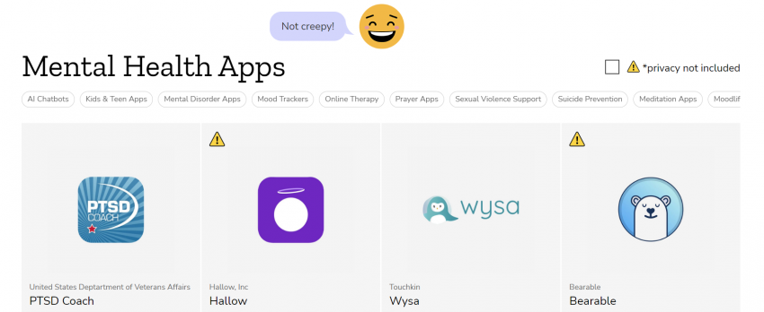 На сайте Mozilla можно найти руководство *Privacy Not Included, где собраны проверенные компанией приложения. У большинства из них есть желтый предупреждающий ярлык, который означает несоответствие стандартам безопасности пользователей. По мнению исследователей, это крайне важный вопрос, т.к. приложения собирают очень личную и деликатную информацию, но обеспечить в дальнейшем ее сохранность и анонимность могут не всегда. Кроме того, сервисы разрешают слабые пароли, имеют расплывчатые политики конфиденциальности и обмениваются данными.