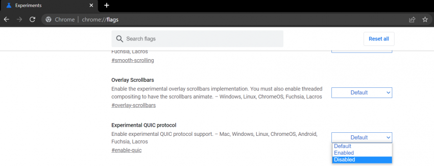 - На канале sale_caviar предлагается такой способ: в Chrome можно ввести в адресную строку chrome://flags, найти #enable-quic и выставить значение Disabled (для Opera аналогично через opera://flags/). Для Firefox – ввести в адресную строку аbout:config, найти network.http.http3.enable и установить значение false.