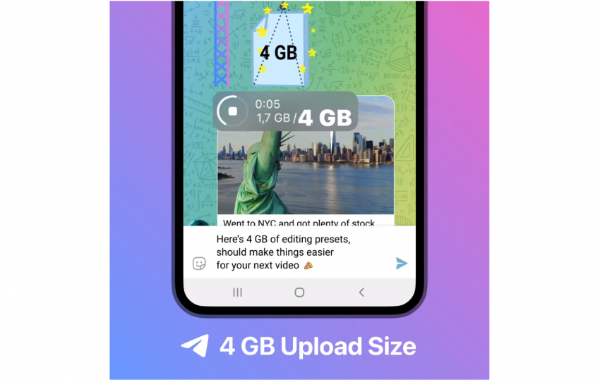 Сейчас пользователи могут отправлять файлы объемом до 2 ГБ, а для обладателей подписки этот лимит будет увеличен вдвое. При этом скачивать такие файлы смогут все, вне зависимости от наличия Telegram Premium.