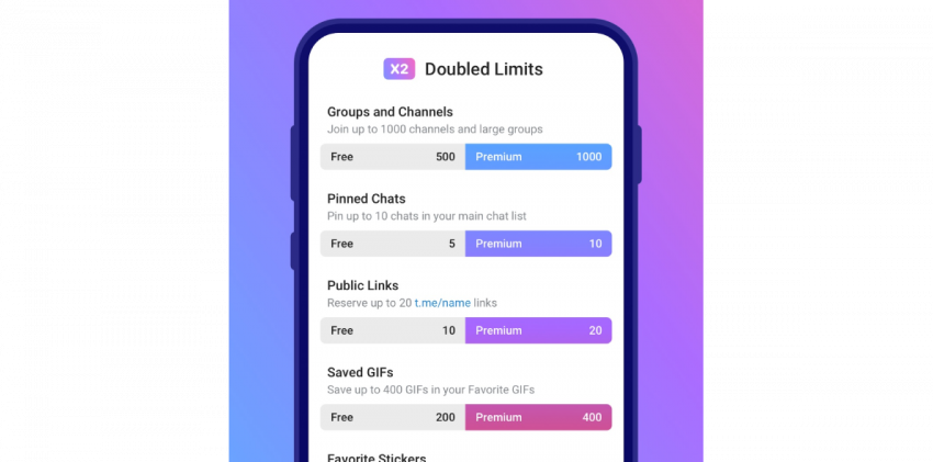 Обладателям подписки доступно будет закреплять до 10 чатов, создавать до 20 папок вместимостью по 200 чатов, также оформлять до 1000 подписок на каналы.