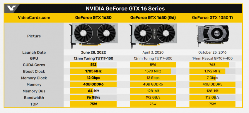 В GTХ 1630 будет установлен чип TU117-150 c 512 ядрами CUDA. Это намного меньше, чем в большинстве видеокарт NVIDIA из игрового сегмента. Новая видеокарта построена на базе более старой архитектуры RTX 30 серии.