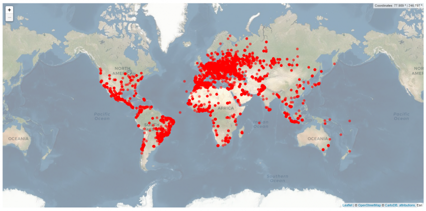 Карта распространенности автомобилей с GPS-трекером MV720 от MiCODUS. Изображение: www.bitsight.com