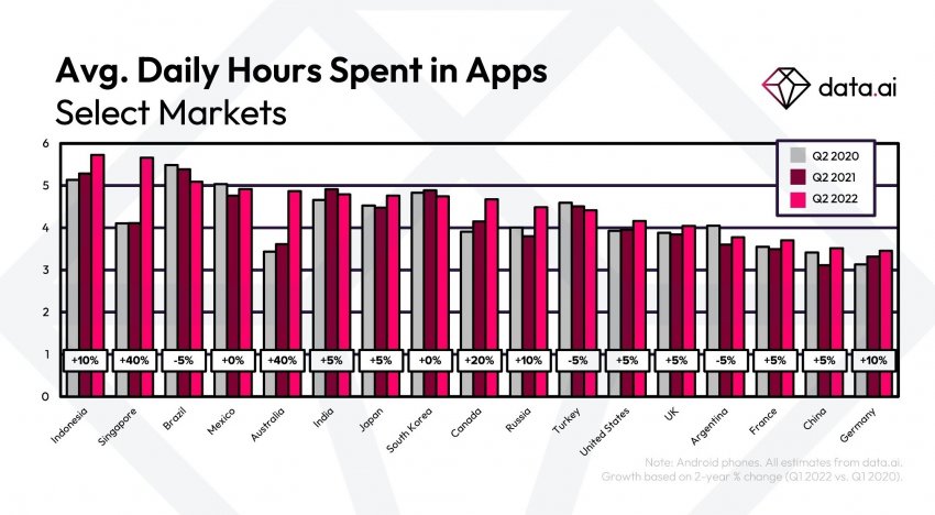 Компания data.ai исследовала, сколько времени люди проводят в своих смартфонах. Так выяснилось, что потребители 12 мировых рынков теперь тратят на приложения от 4 до 5 часов в день, причем дольше других это делают в Индонезии – 5,7 часов ежедневно.