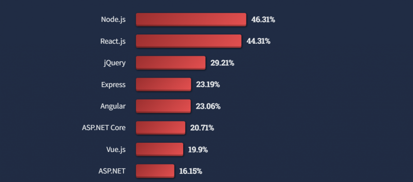 - Самым популярным фреймворком оказался Node.js (46.31%). Второе место занимает React (44.31), а третье – JQuery (29.21). При том важно отметить, что эти фреймворки зачастую используются вместе, так как решают разные задачи (отсюда и странности в распределении процентного соотношения).