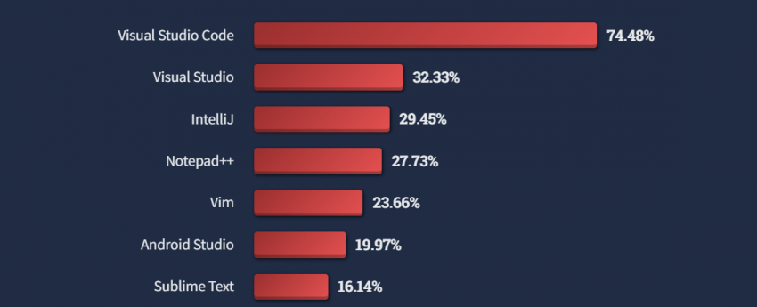 - Самым используемым редактором стал Visual Studio Code. Что неудивительно, так как он распространяется бесплатно и имеет гибкую систему плагинов. Второе место занимает Visual Studio – инструмент для разработки под Windows. Решения от JetBrains оказались на 3 месте, далее идут Notepad, Vim и т.п.