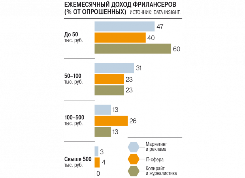 Коммерсантъ пишет, что чаще респонденты оказывают услуги в трех областях – это IT и разработка с 34%, копирайт и журналистика с 32%, а также маркетинг и реклама с 28%. Данные по оплате труда для каждой сферы представлены на графике ниже.