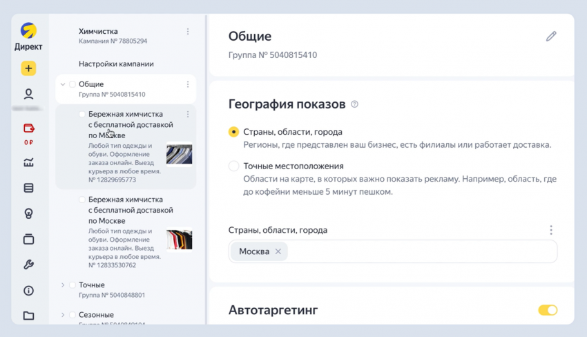 - Блок редактирования – для изменения настроек кампании, группы или объявления.