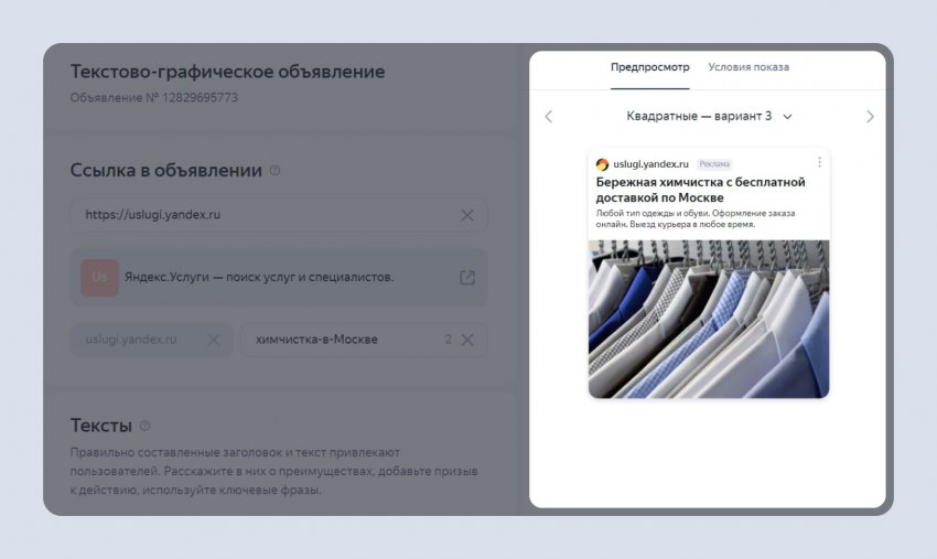 - Предпросмотр и условия показа – для отображения, как созданные креативы будут выглядеть на площадках.