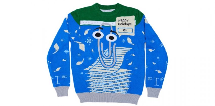 Раз в год в преддверии новогодних праздников Microsoft выпускает «уродливый» свитер. Это уже пятый свитер, он вновь посвящен теме Windows, и главный герой – скрепка-помощник из Microsoft Office.