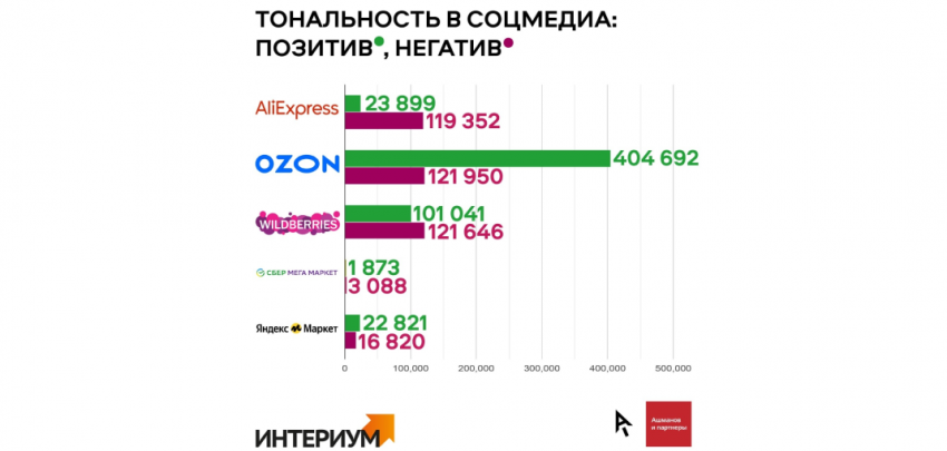 Компания «Ашманов и партнеры» и совместно с digtial-агентством «Интериум» провели исследование и выяснили, как пользователи в РФ оценивают работу маркетплейсов и как эти платформы строят коммуникацию в сети. Исследование проводилось с мая по август 2022 года, оценивались тональность и количество упоминаний площадок в поиске, СМИ и соцсетях, а также формат общения маркетплейсов с пользователями.