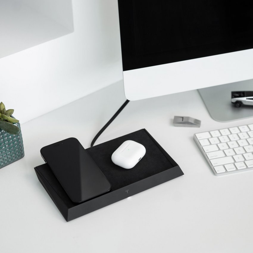 Создатели утверждают, что при разработке дизайна вдохновлялись футуристическим электропикапом Cybertruck. Аксессуар стоит $300 и может одновременно заряжать до трех устройств, совместимых со стандартом QI, на мощности до 15 Вт. Его корпус выполнен из алюминия, а поверхность декорирована алькантарой премиум-класса. В комплекте имеется кабель USB Type-C, адаптер питания на 65 Вт и съемная магнитная подставка.