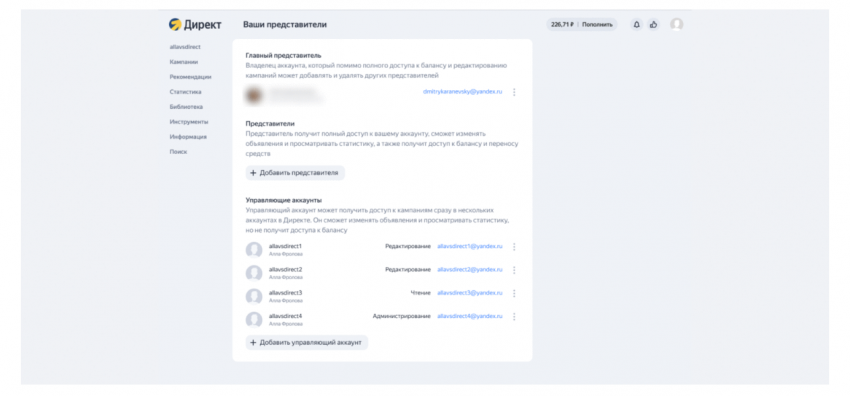 В сервисе контекстной рекламы Яндекс Директ появилась возможность управлять представителями аккаунта: