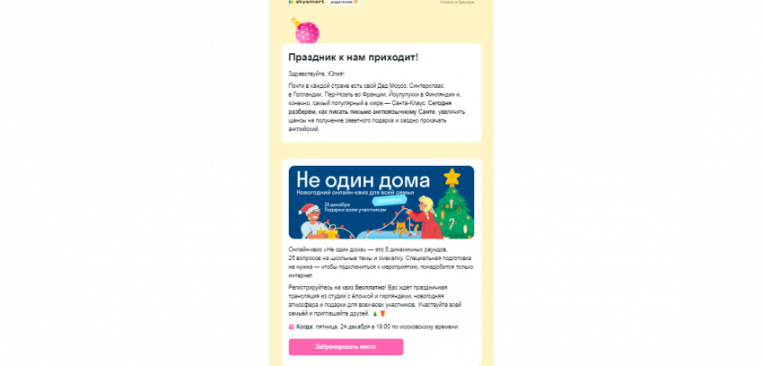 Чтобы ваша новогодняя рассылка стала наиболее конверсионной, рассказывайте в начале письма о выгоде, которую получит пользователь от компании. Например, это может быть скидка 20% или приглашение на онлайн-мероприятие в честь Нового года.