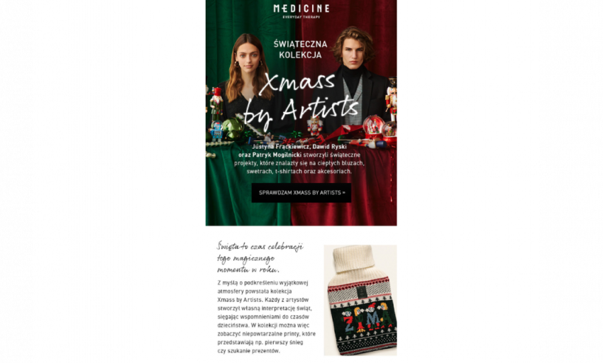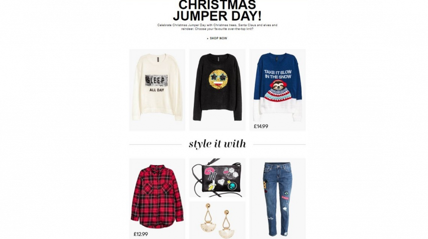 Обратите внимание, как поступила команда H&M со своей новогодней рассылкой – она не создала новогоднее оформление, а решила зарядить праздничным настроением через свою продукцию. Вещи напоминали о предстоящем Новом годе и притягивали внимание пользователей своим дизайном.