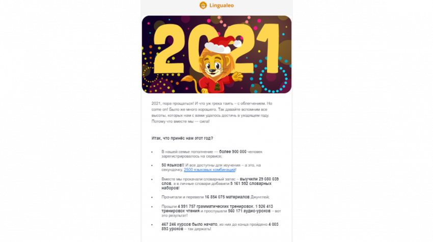 Не всей аудитории интересно, что происходило с компанией в течение года. Однако если связать эту информацию с подписчиками, то такая рассылка обретет совсем иной эффект. Например, Lingualeo рассказали, что в их сервисе зарегистрировалось более 900 000 человек, а всего пользователи прошли более 4 млн грамматических тренировок. Такая статистика повышает лояльность аудитории и формирует особое чувство: «Круто! А я ведь тоже участвовал в этом».