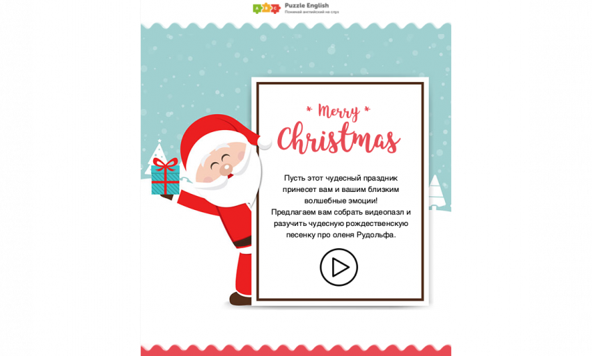Либо вы можете создать полноценную игру, как это сделала компания Puzzle English. Она предложила своим читателям собрать видеопазл и разучить рождественскую песню. Такая рассылка не подталкивает к покупкам, но зато привлекает внимание аудитории. Подписчики включаются в игру, и кто-то из них вполне может захотеть повзаимодействовать с компанией, например, воспользоваться ее приложением или купить новогодние товары.