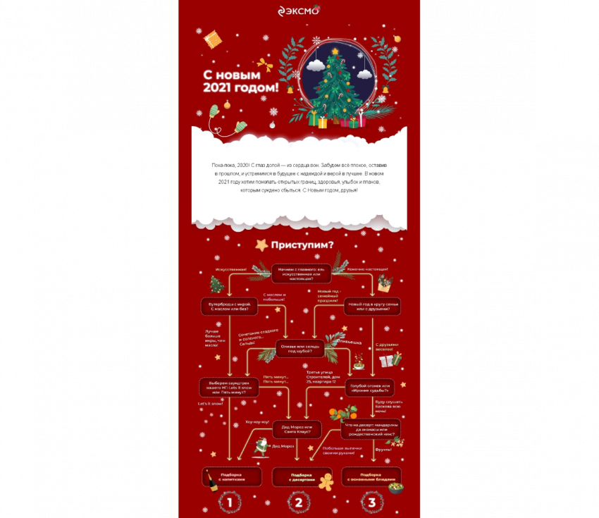 Также вы можете создать новогоднюю рассылку с классической игрой, как это сделала компания Эксмо. Она предложила своим читателям определить вкусовые предпочтения, исходя из которых формировалась уникальная подборка товаров.