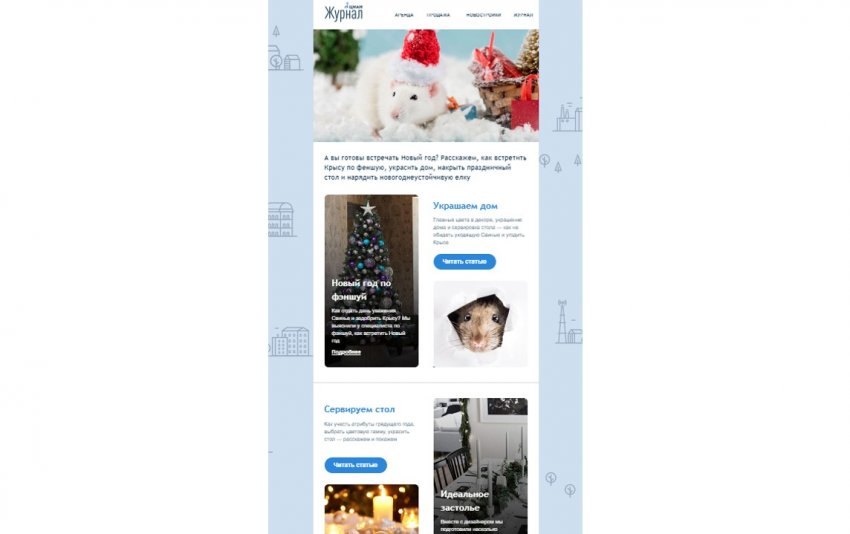 Перед началом Нового года люди ищут не только подборки классных подарков, но и идеи для того, как провести этот прекрасный праздник. Например, в email-рассылке вы можете дать своим подписчикам советы о том, как украсить свой дом или разнообразить праздничный стол. Также это может быть подборка популярных мест, которые посещают во время Нового года.