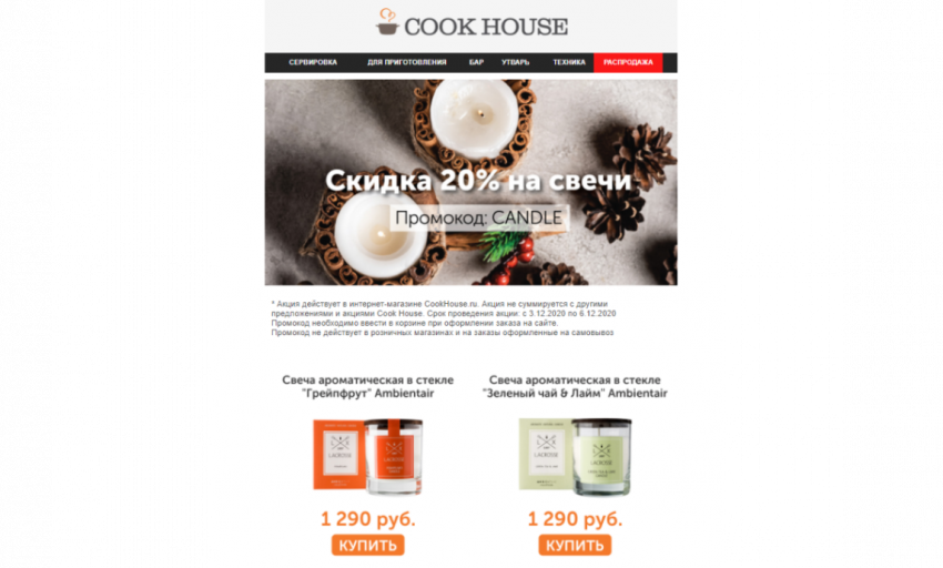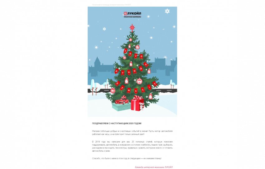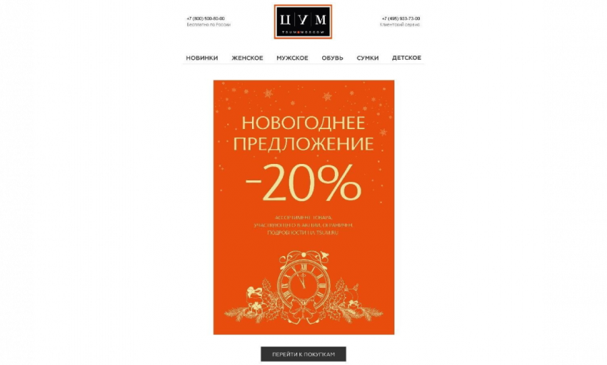 Всем известный ЦУМ отправлял своим подписчикам приятный бонус в виде 20%-й скидки на новогоднюю продукцию. Рассылка была оформлена в минималистичном стиле, но передающем праздничное настроение.