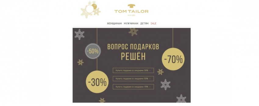 Интернет-магазин Tom Tailor предлагал своим подписчикам 3 варианта скидок. Чтобы посмотреть, на какие товары была предоставлена скидка, нужно было перейти на официальный сайт. Рассылка была оформлена с использованием фирменного цвета и новогодних атрибутов.