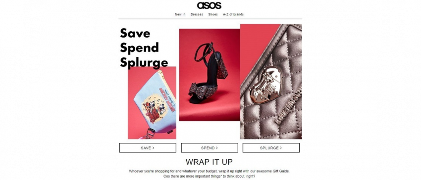 Еще один интернет-магазин, который вовлекал аудиторию с помощью рождественских рассылок, – ASOS. Акцент был на постоянных продажах, но тема подарков также упоминалась. Что приятно, так это возможность вписать подарки в разные бюджеты: можно сэкономить, побаловать себя и похвастаться.