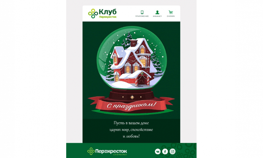 Супермаркет Перекресток вовсе решил не предлагать никаких товаров, а просто поздравил свою аудиторию с Новым годом. Рассылка получилась яркой и милой.