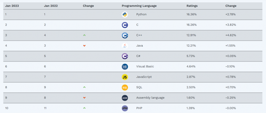 По данным компании TIOBE Software, в январе 2023 года лидерами среди языков программирования стали Python, C и C++. При этом С++ обошел в рейтинге Java и за год набрал +4,62% популярности среди пользователей.