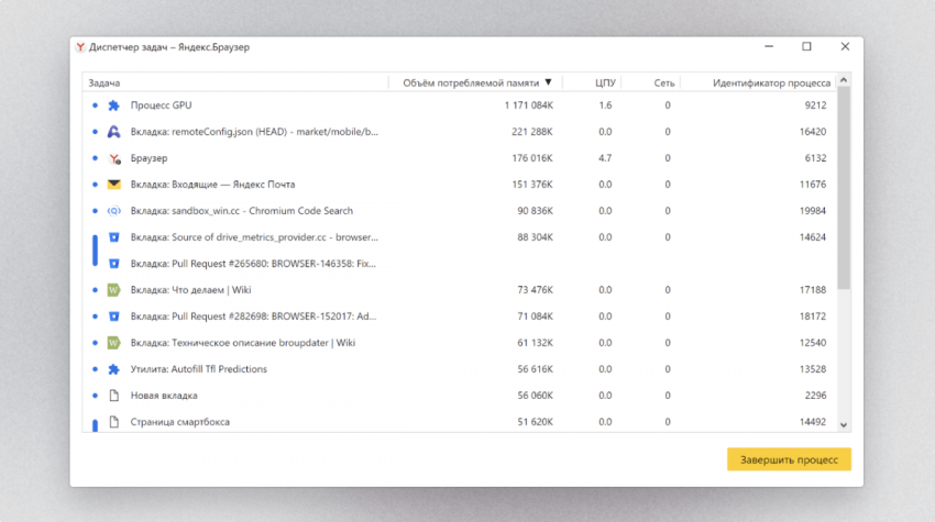 Яндекс Браузер, как и любой другой, использует множество взаимосвязанных процессов для решения различных задач. К примеру, отдельный процесс отвечает за отображение страниц, другой – за быстрый показ содержимого, и так далее. Все они отображаются во внутреннем «Диспетчере задач».