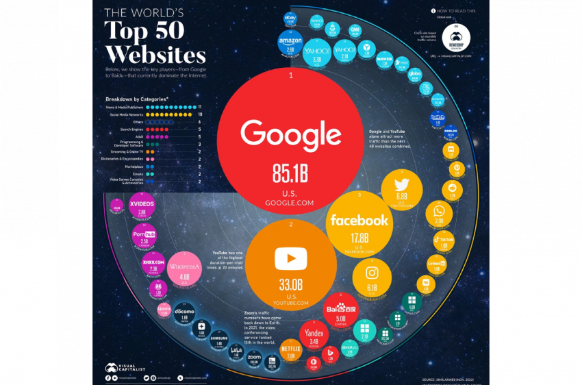 Специалисты Visual Capitalist подсчитали, что к 2023 году в мире насчитывется более 2 миллиардов сайтов, а самыми посещаемыми из них являются Google и YouTube (видеохостинг также принадлежит Google). Всего в топе отражены 50 ресурсов, причем на первые два сайта приходится больше трафика, чем на все остальные 48 сайтов в совокупности.