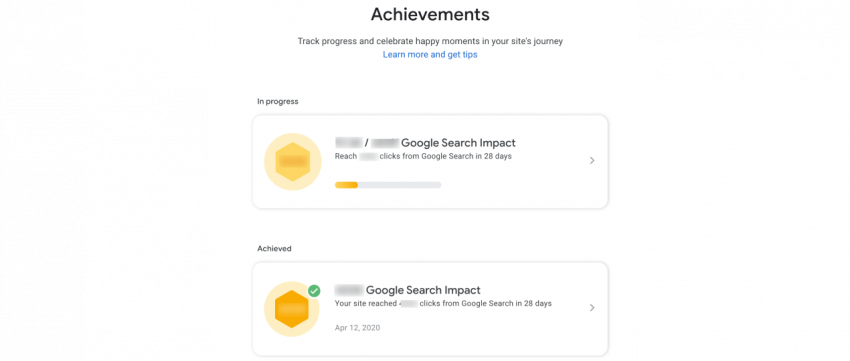 Система анализирует данные с 2019 года (в зависимости от даты подключения сайта к Google Search Console) и отражает процесс получения каждого достижения.