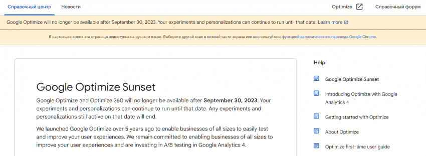30 сентября 2023 года команда Google отключит сервисы Optimize и Optimize 360 (расширенная платная версия), использующиеся для тестирования гипотез и персонализации сайтов. В компании рекомендуют выгрузить все свои данные до даты окончания работы.