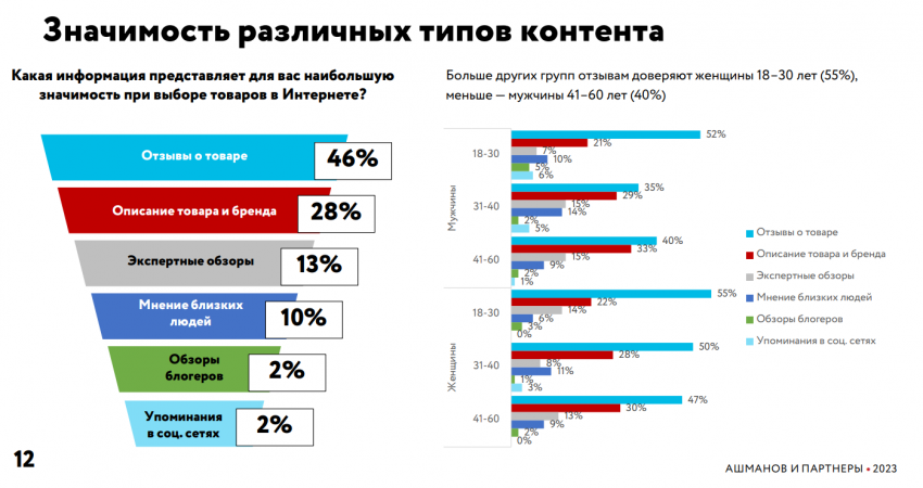 Исследователи «Ашманов и партнеры» заключают, что товарные описания остаются базовым контентом, который хотят видеть потребители при поиске товаров (а чем они дороже и сложнее, тем более внимательно люди читают описания). При этом больше всего покупатели интересуются отзывами, и их наличие может стать преимуществом для интернет-магазина. Стоит мотивировать своих пользователей оставлять развернутые отзывы о товарах, поскольку такое представление продукции выполняет функцию продавца-консультанта из офлайн-магазина.