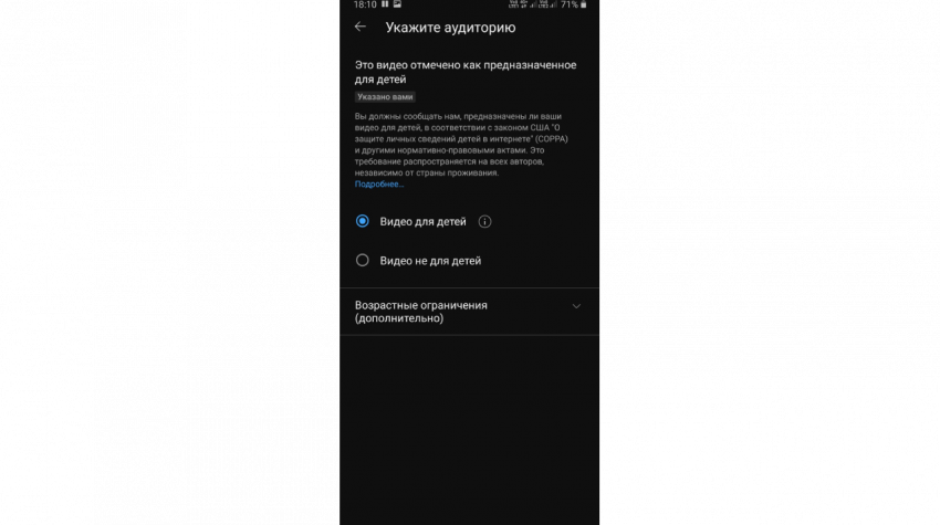 В разделе «Аудитория» укажите, можно ли смотреть загружаемый ролик детям. Какие видео на данной платформе считаются подходящими для детей, можно уточнить здесь.