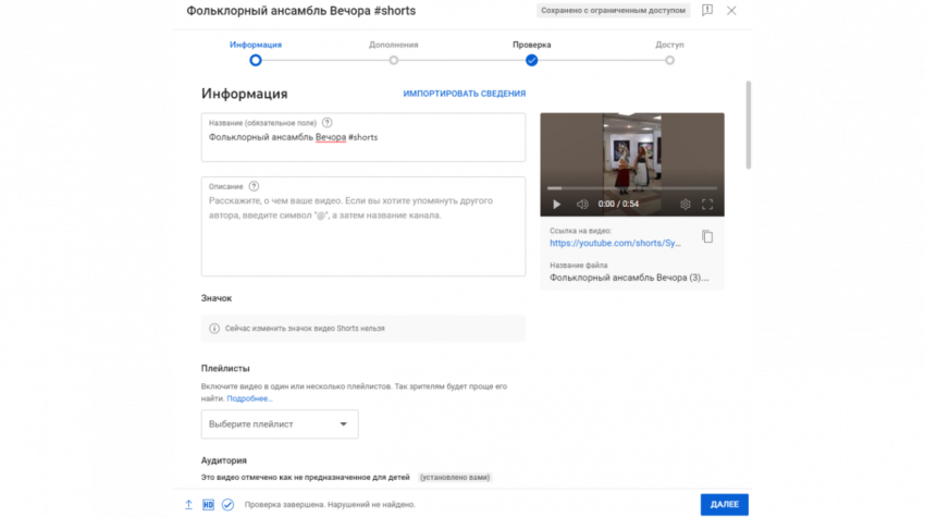 Ниже можно ввести описание, выбрать аудиторию и др. Для перехода к следующим этапам загрузки – «Дополнения» и «Проверка» – нажимайте кнопку «Далее». На последнем шаге укажите параметры доступа и кликните на кнопку «Сохранить».