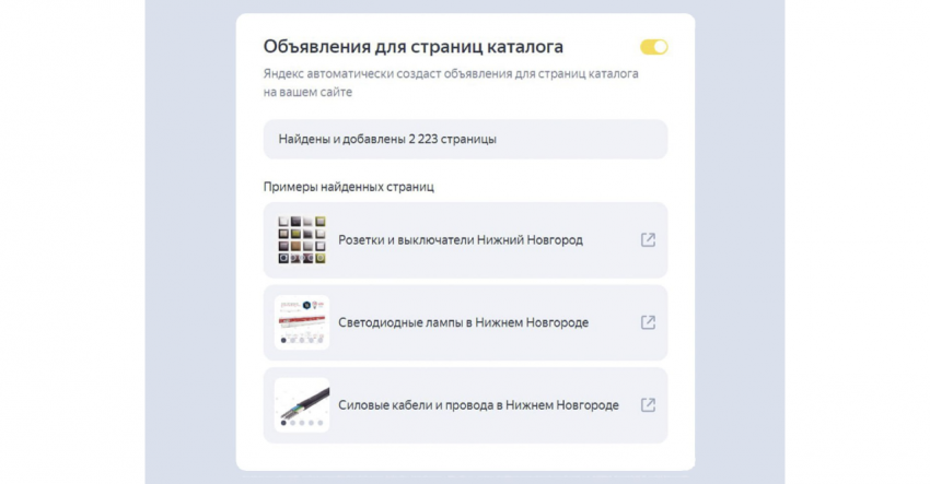 Для использования функции необходимо включить тумблер «Объявления для страниц каталога», так они сгенерируются автоматически и будут выглядеть как обычные текстово-графические объявления. Реклама будет запущена в Поиске и сетях.