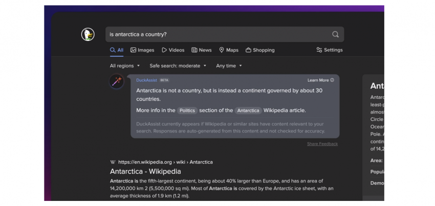 Сервис DuckDuckGo не остался в стороне от внедрения ИИ и чат-ботов в поиск и запустил новую опцию DuckAssist, сообщает Ars Technica. Работает это так: если на вопрос пользователя можно ответить информацией из Википедии, что ИИ предложит это сделать, а после резюмирует сведения из энциклопедии и выдаст короткий ответ.