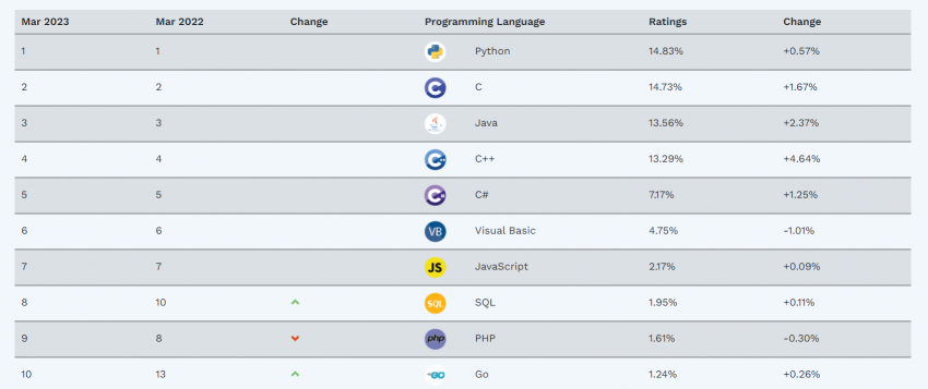 В итоге мартовский рейтинг TIOBE выглядит так: