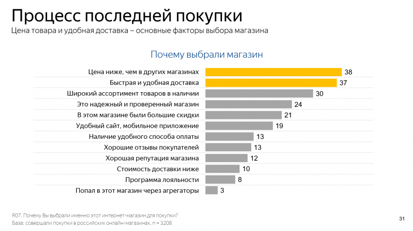 Согласно ежегодному исследованию поведения онлайн-покупателей, проведенного Яндекс Маркетом и GfK в 2022 году, на выбор магазина больше всего влияют низкая цена и наличие скидок, а также быстрая и удобная доставка.